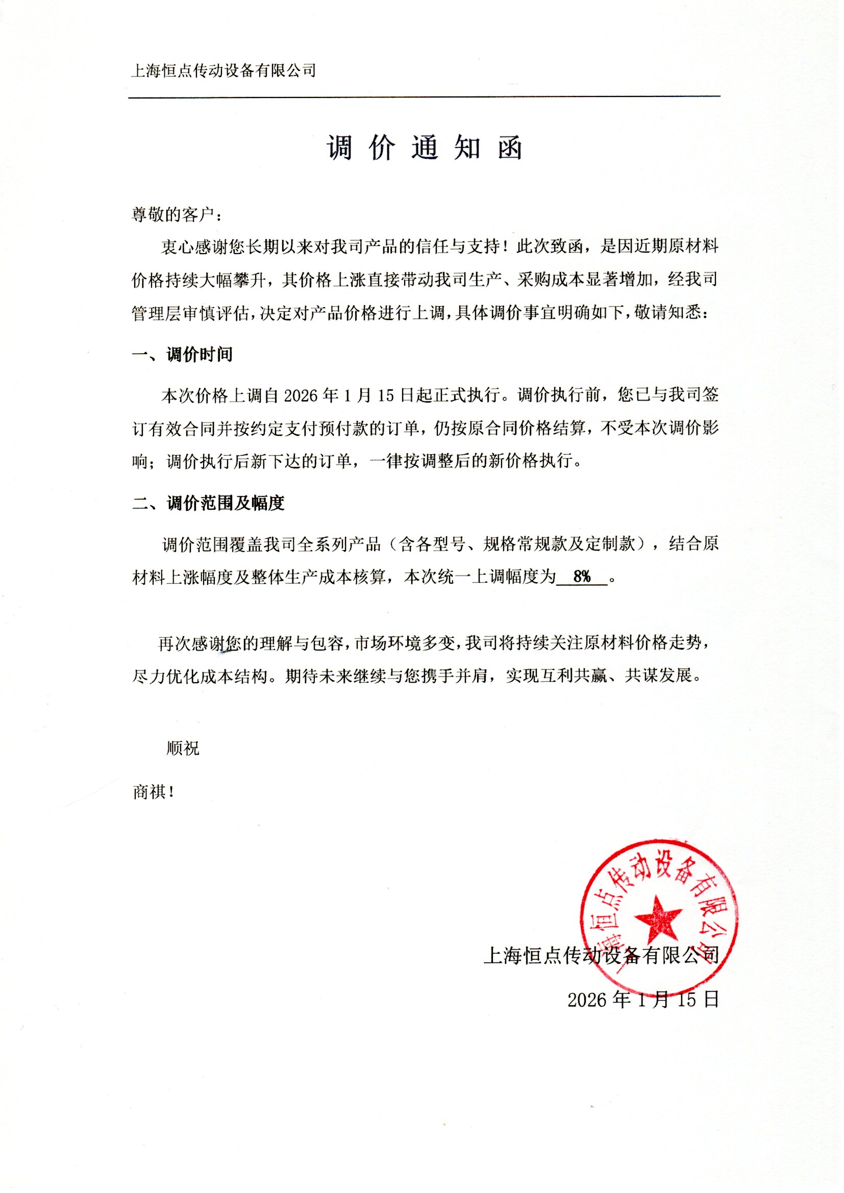 本次價格上調自2026年1月15日起正式執行。調價執行前,您已與我司簽訂有效合同並(bìng)按約定支付預付款的訂單 ,仍按原合同價格結算,不受本次調價影響;調價執行後新下達(dá)的訂單,一律按調整後的新價格執行。