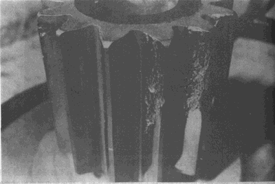 氮化小齒輪幾個輪齒上最大負載區域的剝落。