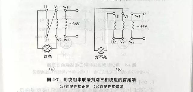 先用萬用表将繞組的6根引線分成3個獨立繞組,然後按圖4-7所示的接法通以低壓交流電(diàn)源(所加電(diàn)壓應使繞組中的電(diàn)流不超過額定值)。如果燈(dēng)泡發亮,則說明串聯的U、V兩相繞組是正向串聯。即一相繞組的首端接另一相繞組的尾端,如圖4-7(a)所示。如果燈(dēng)泡不亮 ,則說明是反向串聯,如圖4-7(b)所示。這時,可将一相繞組的首尾端對調再試。判斷出前兩相的首尾端後,将其中一相再與第三相串聯,用同樣方法實驗。最後,可以判斷出三相繞組各自的首尾端。