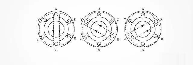 當(dāng)交流電相位θ=2400時 ,IC=0,IA爲負,IB爲正,此時,線端C、Z沒有電流,繞組AX電流從(cóng)X流進A流出,繞組BY電流從(cóng)B流進Y流出,由安培右手螺旋定則得到圖(c)中磁感線方向(如虛線箭頭所示)。