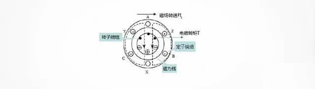 由於(yú)旋轉磁場不斷切割轉子中的閉合導體,産生感應電動勢和感應電流,再由轉子中的感應電流和旋轉磁場的相互作用産生電磁轉矩,使得轉子随著(zhe)旋轉磁場的方向同向運轉。比如籠型異步電動機,由於(yú)旋轉磁場順時針切割轉子導體,相當於(yú)導體逆時針轉動 ,運用右手定則,讓磁感線垂直穿過手心,拇指指向導體的運動方向,四指的方向就是感應電流的方向(如圖4所示籠型異步電動機轉子繞組電流的方向),然後應用左手定則,磁感線穿過手心,四指指向電流運動方向,大拇指方向即爲轉子受到電磁力的方向(如圖所示電磁轉矩矩T方向),在電磁力的作用下形成電磁轉矩,拖動轉子順著(zhe)旋轉磁場的方向轉動。