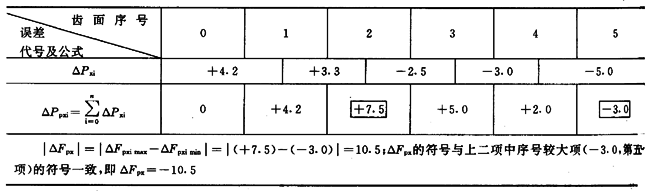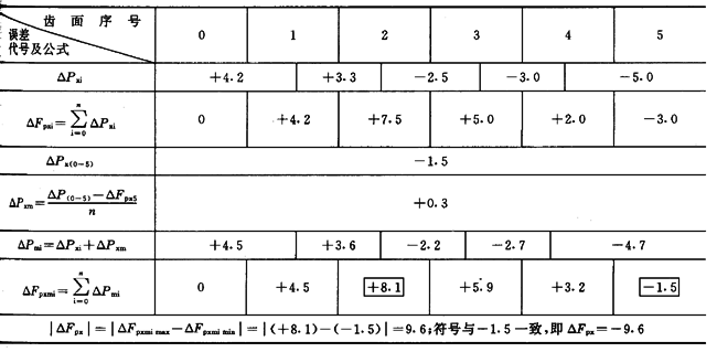 由指示表讀出的逐齒軸向齒距偏差ΔPxi經計算得到ΔFPX(見表13)。