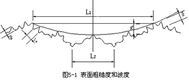 加工表面的微觀幾何特征主要包括表面粗糙度和表面波度兩部分組成,如圖 5— 1所示。表面粗糙度是波距 L小於(yú) 1mm的表面微小波紋;表面波度是指波距 L在 1~ 20mm之間的表面波紋。通常情況下,當(dāng) L/H(波距 /波高)﹤ 50時爲表面粗糙度 , L/H=50~ 1000時爲表面波度。