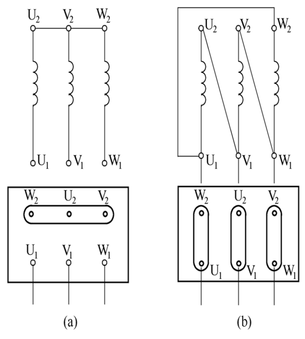 三相繞組由三個彼此獨立的繞組組成,且每個繞組又由若幹線圈連接而成。每個繞組即爲一相,每個繞組在空間相差120°電角度 。線圈由絕緣銅導線或絕緣鋁導線繞制。中、小型三相電動機多採用圓漆包線,大、中型三相電動機的定子線圈則用較大截面的絕緣扁銅線或扁鋁線繞制後,再按一定規律嵌入定子鐵心槽内。定子三相繞組的六個出線端都引至接線盒上,首端分别标爲U1, V1, W1 ,末端分别标爲U2, V2, W2 。這六個出線端在接線盒裏的排列如圖所示,可以接成星形或三角形。