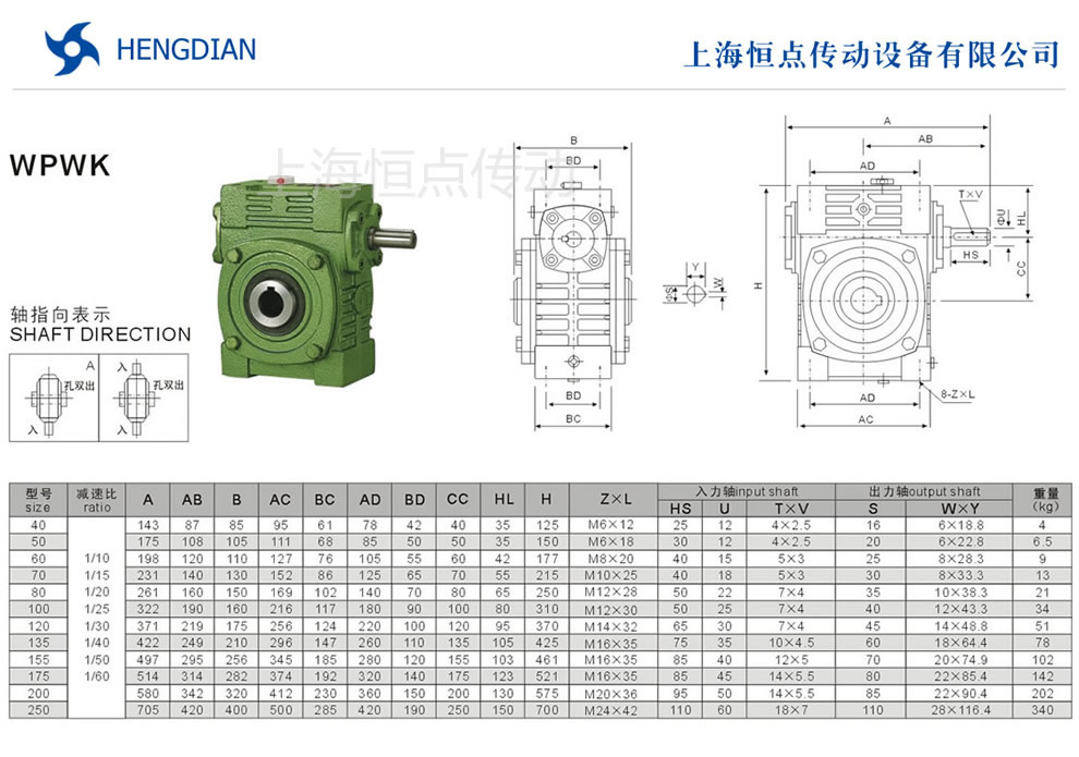 WPWK萬能型減速機的外形尺寸及安裝尺寸.WPWK系列萬能型蝸輪蝸杆減速機選型指南,WPWK萬能型減速機軸輸入,軸輸出.WPWK萬能型減速機軸指向表示方法.機座号40到250,速比10到60.